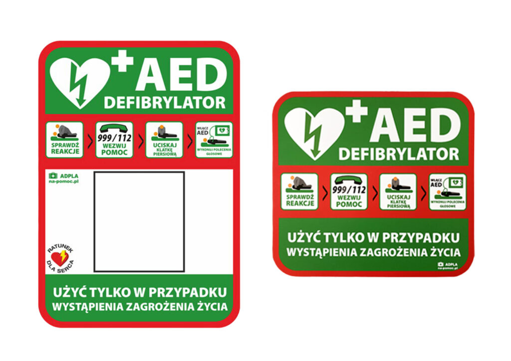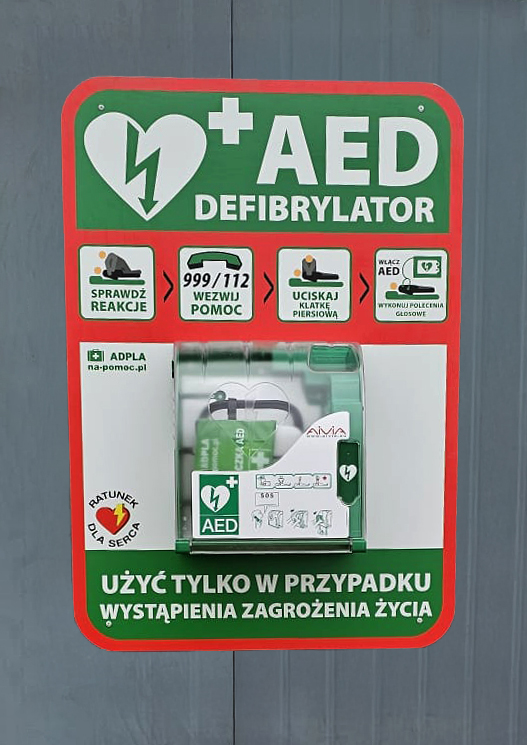 - Tablicę „Obiekt wyposażony w defibrylator AED”