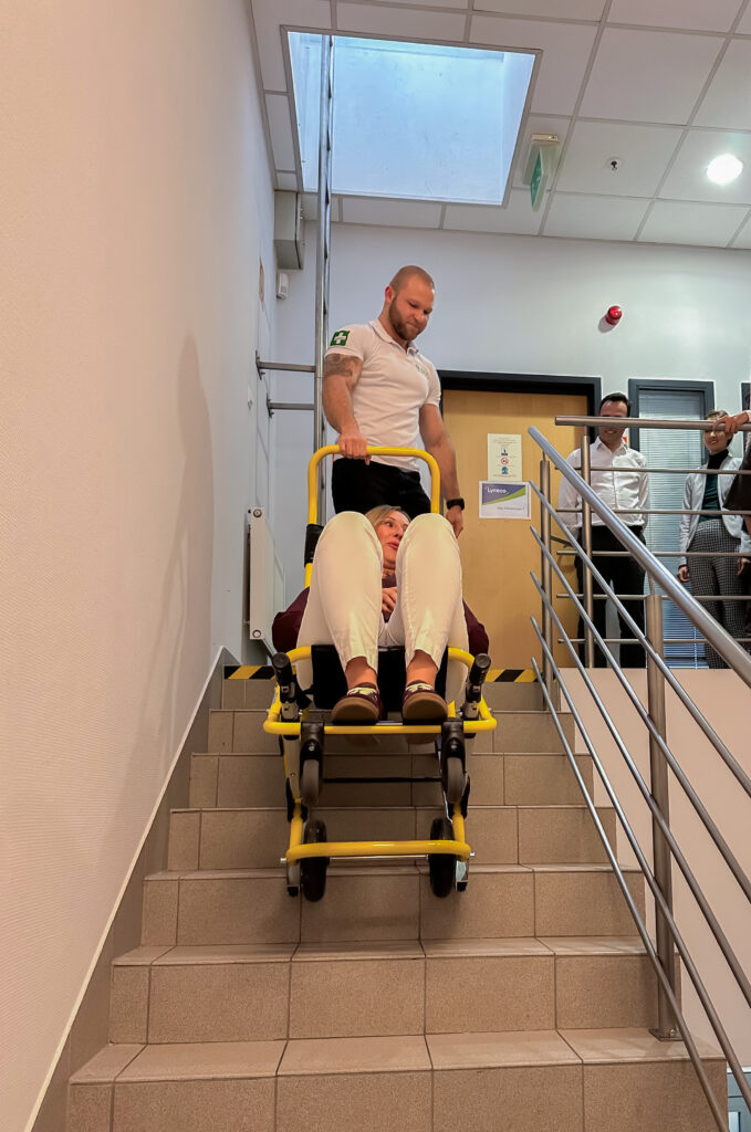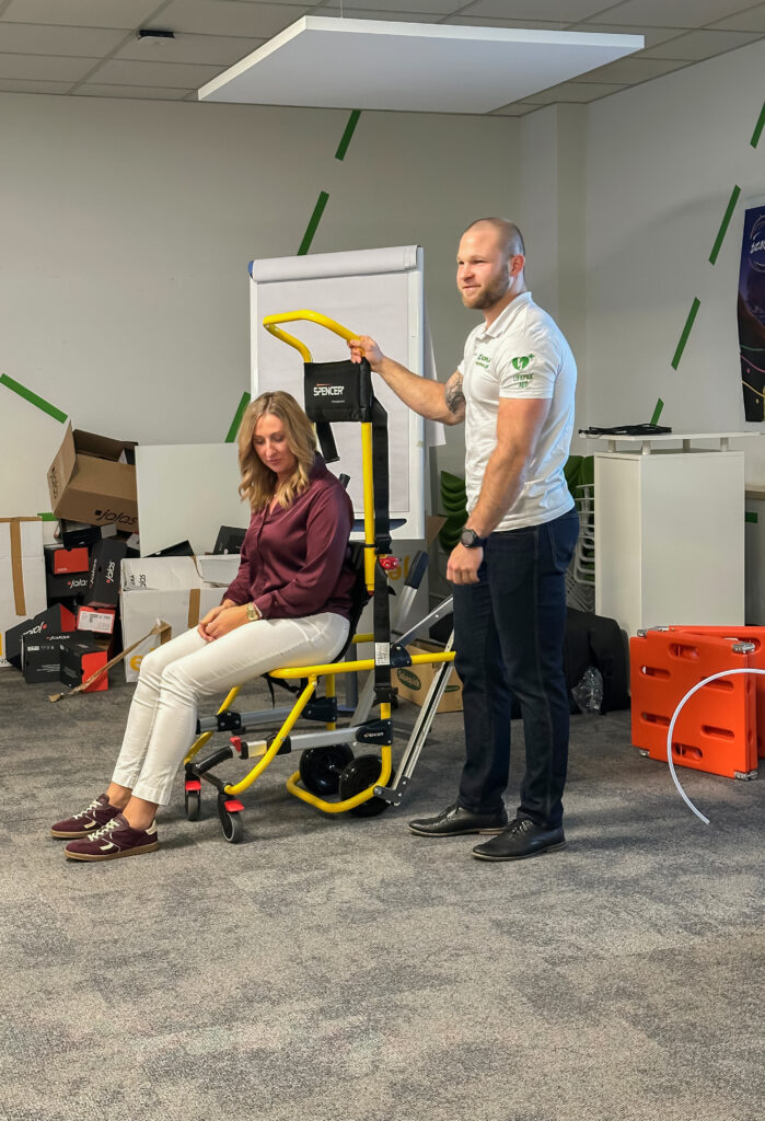 defibrylator LIFEPAK CR2, produkty pierwszej pomocy Cederroth, krzesełka ewakuacyjne, oczomyjkę Unicare oraz przenośne prysznice bezpieczeństwa TOF.
